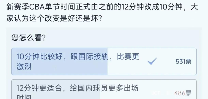 那么将CBA单节的时间,由之前的12分钟调整为10分钟,到底是一件好事儿,还是坏事儿?有媒体人发起了一项投票,其中支持这项决定的球迷占到多数。