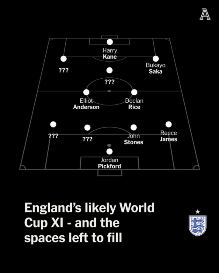 TA: 英格兰队世界杯7个首发位置已确定 贝林、帕尔默、福登争主力