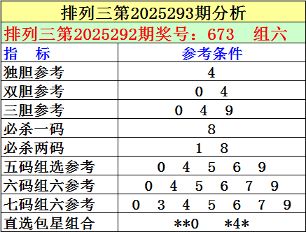 1.排列三最近十期分别开出号码:057-247-905-641-180-504-685-125-948-673,其中有6期奖号开出了上期的重复号码,本期防重号轮空,排除第2025292期奖号:673中的号码,关注号码:0。