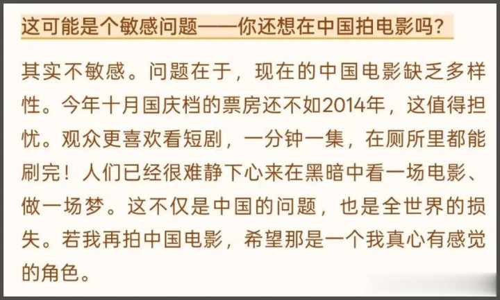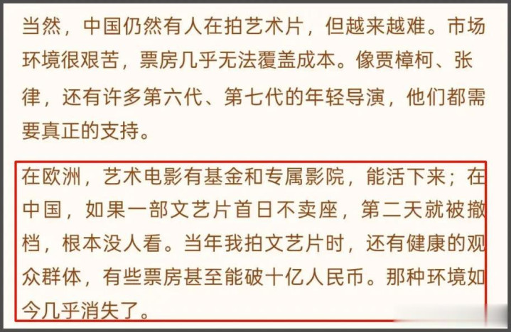 范冰冰又拿国内外艺术片做比较。说中国电影艺术片市场环境越来越难,夸赞欧洲艺术电影有基金和专属影院,但国内的文艺片没有这种待遇,而且如果首日不卖座,之后面临的就是撤档。话里话外都是在说国内电影对文艺片的支持度不够,还说自己当年拍文艺片的时候,还有健康的观众群体,票房甚至都能破十亿。