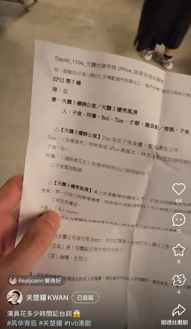 之后在看到关楚耀晒出的剧本,可以清楚地看到,原来关楚耀当天的一句对白只有一个字“呃”,不得不说还真的是十分简短。